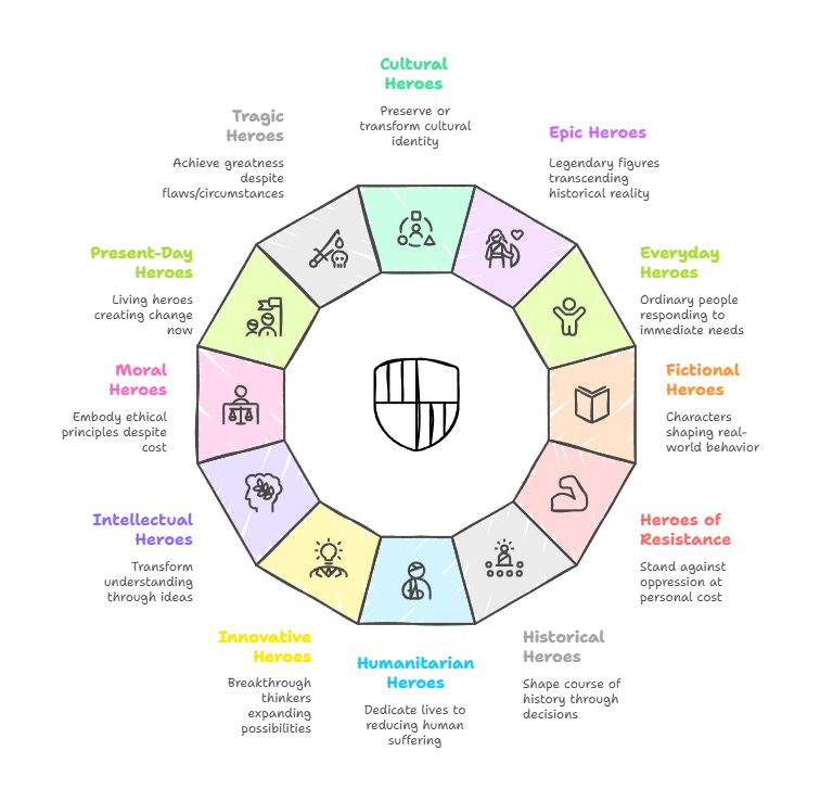 What I needed was a framework comprehensive enough that no hero would slip through the cracks. Whether they're fighting on battlefields or in boardrooms, whether they're creating art or curing diseases, whether they lived 3000 years ago or are making headlines today – I needed categories that could capture them all.