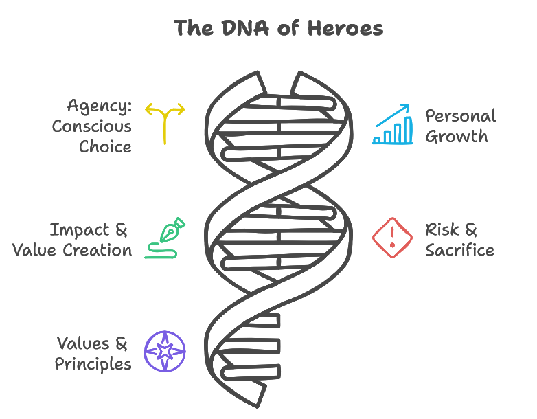 I've started digging into the lives of history's greatest game-changers, and something fascinating emerged. Whether I was studying scientists who revolutionized our understanding of the universe or leaders who transformed nations or even everyday people who saw injustice and refused to look away – five core elements kept showing up. Think of them as the DNA of heroic character: Agency, Personal Growth, Impact, Risk & Sacrifice, and Values & Principles.