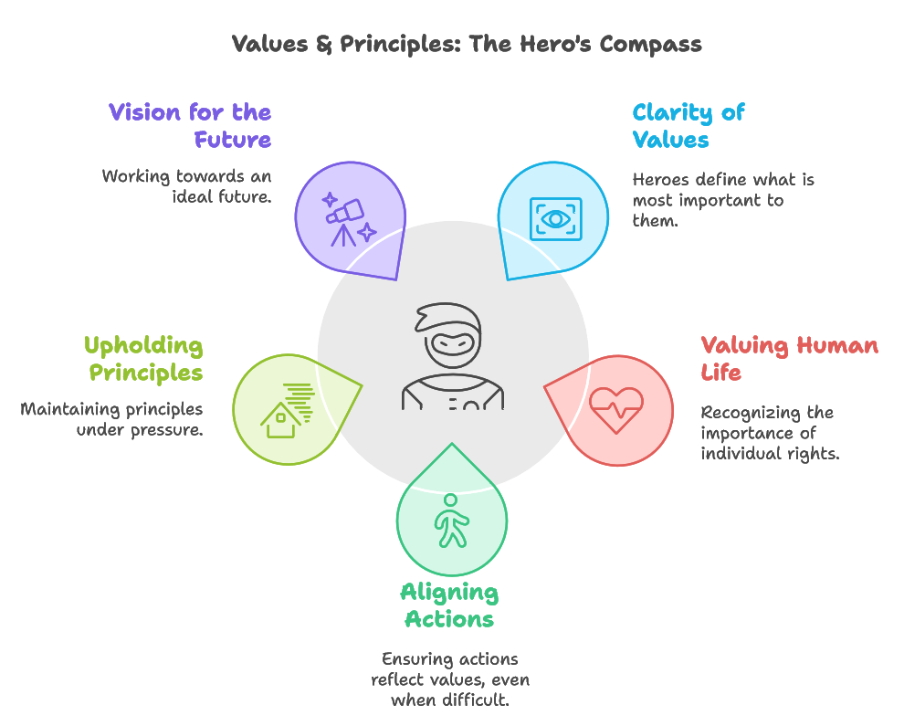 Now we're getting to the heart of it all. You want to know what really makes someone heroic? It's not their powers or their platform – it's their principles. Heroes know what they value, and they let those values guide their choices, even when it costs them.